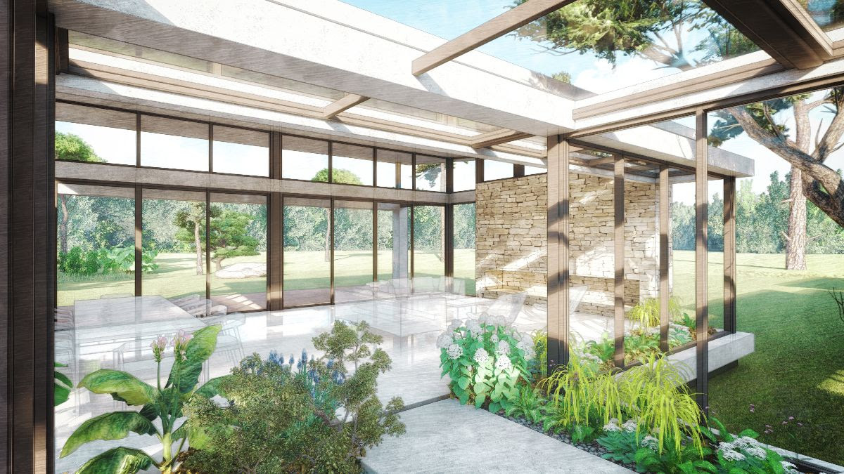 Strategically located, a greenhouse welcomes you as you enter the residence becoming the heart of its three wings. As you walk through the home the greenhouse takes a life of its own as it continues to develop through hallways and social areas turning everyday living into an exciting experiential journey filled with the views of the interior and exterior landscape.